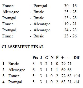 Salle des Malteries à Schiltigheim 2 000 spectateurs environ. Arbitrage de MM. Garcia et Moreno. Mi-temps 12-13. ALLEMAGNE : Holpert (1ere-30e, 5 arrêts) et Fritz (31e- 60e, 7 arrêts). Bezdicek 1, von Behren 3, Wenta 2, Immel, Schwartzer 4, Petersen 1, Zerbe 3, Baur, Lakenmacher 4, Roos 5, Kunze, Kehrmann 2. RUSSIE : A. Lavrov (1ere- 30e, 5 arrêts) et Soukosian (31e-60e, 5 arrêts) aux buts. I. Lavrov, Koulintchenko 2, Kokcharov 3 (1 pen), Krivochlykov 2, Voronine, Toutchkine 4, Koudinov 2, Kouselev 1, Torgovanov 8, Khodkov 1, Rastvortsev, Pogorelov, Fillipov 2.