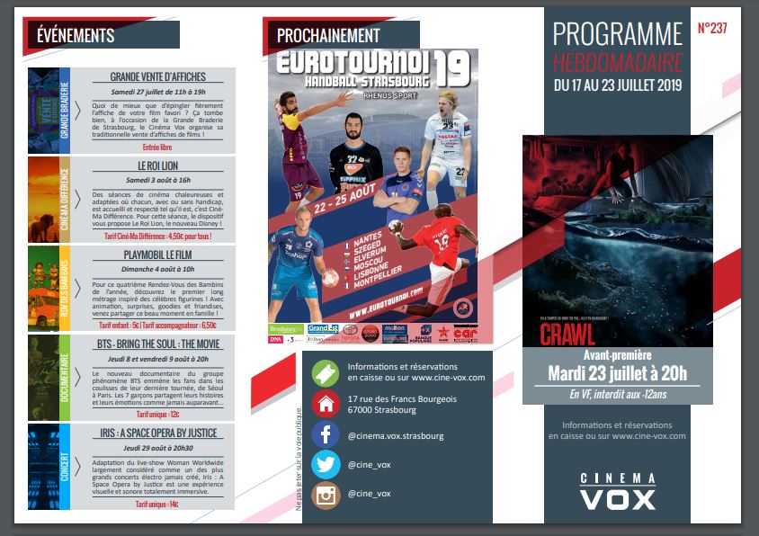 Nous sommes ravis d’annoncer l’officialisation de notre nouveau partenariat avec le Cinéma VOX ! RDV dans les salles de votre Cinéma VOX (17 Rue des Francs-Bourgeois, 67000 Strasbourg) pour le lancement du Roi Lion ! En bonus : le teaser de l’EuroTournoi sur grand écran pour une immersion totale dans l’univers du tournoi. Toujours pas d’abonnement pour la saison 2019-2020 ? Pas d’inquiétude, l’EuroTournoi vous réserve de nombreuses surprises cinématographiques pendant toute la durée de l’évènement !